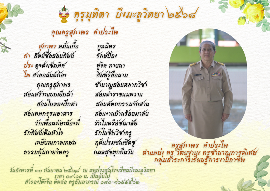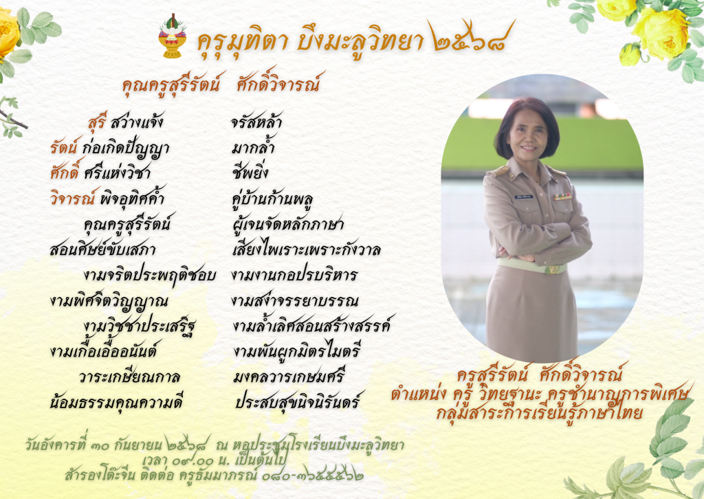 ขอเชิญร่วมแสดงมุทิตาจิต งานเกษียณอายุราชการของ คุณครูสุรีรัตน์ ศักดฺวิจารณ์ และ คุณครูสุภาพร คำประไพ ในวันอังคารที่ ๓๐ กันยายน ๒๕๖๘ ณ หอประชุมโรงเรียนบึงมะลูวิทยา