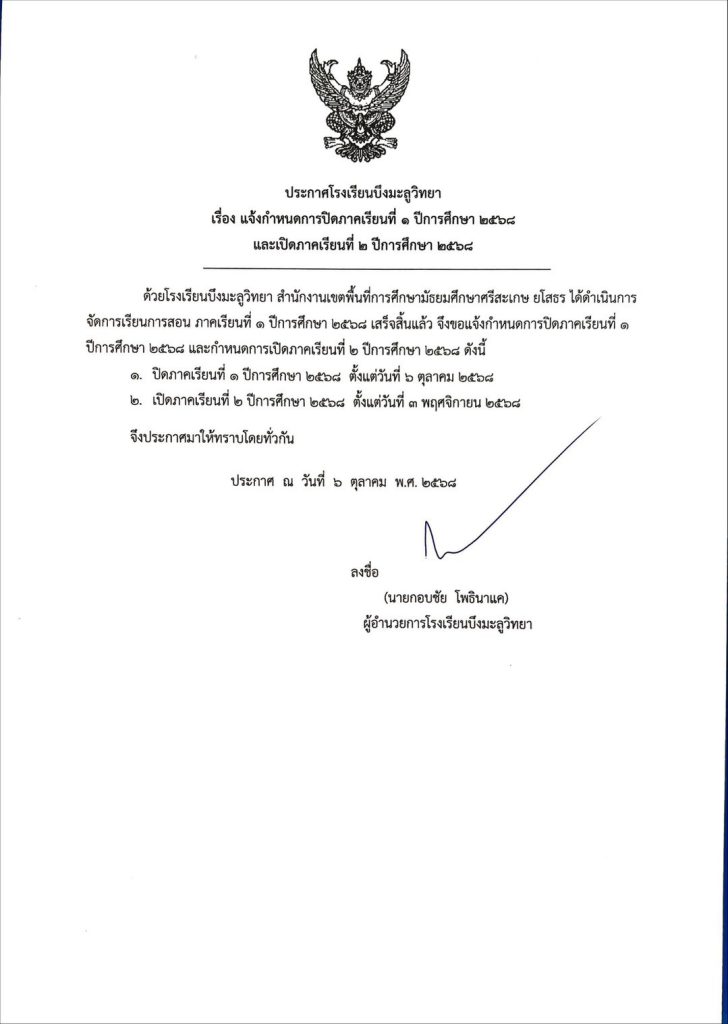 Uncategorized กำหนดการปิด-เปิด ปีการศึกษา ๒๕๖๘ 7 ตุลาคม 2025 admin #ประกาศโรงเรียนบึงมะลูวิทยา เรื่อง แจ้งกำหนดการปิดภาคเรียนที่ ๑ ปีการศึกษา ๒๕๖๘ และเปิดภาคเรียนที่ ๒ ปีการศึกษา ๒๕๖๘
