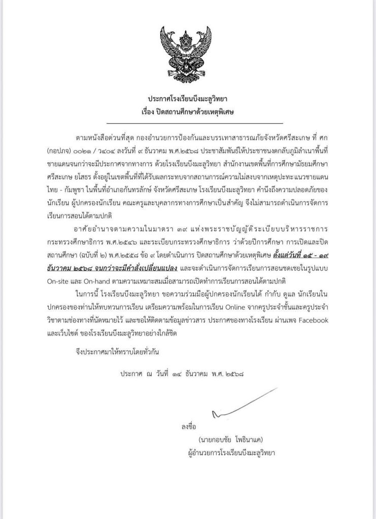 ข่าวประชาสัมพันธ์ การปิดสถานศึกษาด้วยเหตุพิเศษ 14 ธันวาคม 2025 admin ประกาศการปิดสถานศึกษาด้วยเหตุพิเศษประกาศ ณ วันที่ 14 ธันวาคม 2568