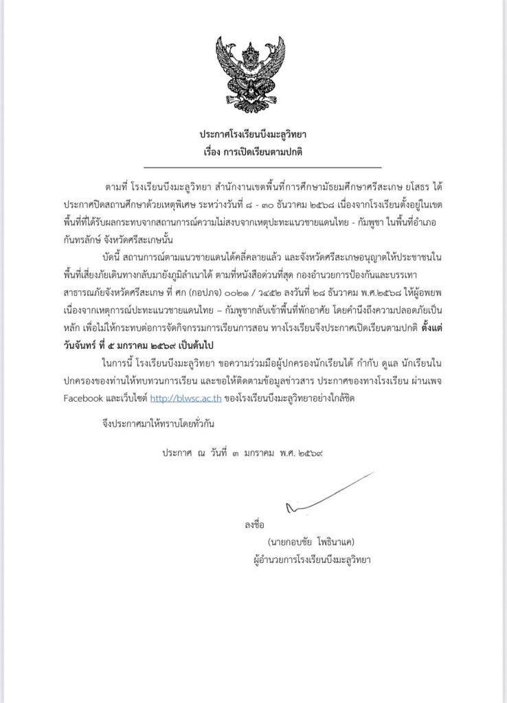 ข่าวประชาสัมพันธ์ ประกาศเปิดเรียนตามปกติ 5 มกราคม 2569 4 มกราคม 2026 admin #ประกาศจากโรงเรียนบึงมะลูวิทยา#เรื่อง_การเปิดเรียนตามปกติ ในวันจันทร์ที่ 5 มกราคม 2569
